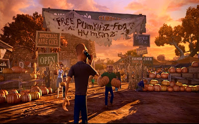 A flying saucer enters Earth's atmosphere and dumps green slime on a pumpkin patch. Jeb (Peter Ramsey), the patch's owner, hears an odd noise and goes outside to investigate. Suddenly, he is attacked and wrapped in pumpkin stalks! The next day, pumpkins are being given away at Jeb's farm. (Free for all "Humanz"!) Dozens of families take them home to make jack o'lanterns.