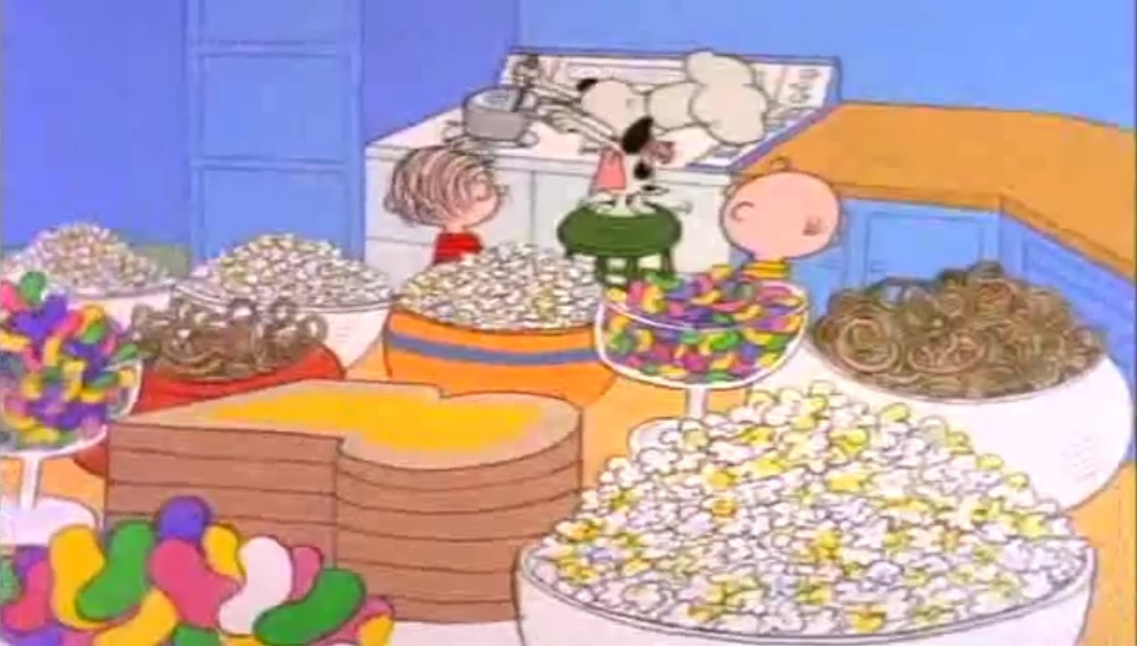 What is the complete menu at Chez Ping Pong? Toast, jelly beans and popcorn, but there seems to be more. For instance, in the still with Linus at table, is that pudding or jello in goblets? Are there other foodstuffs as well?