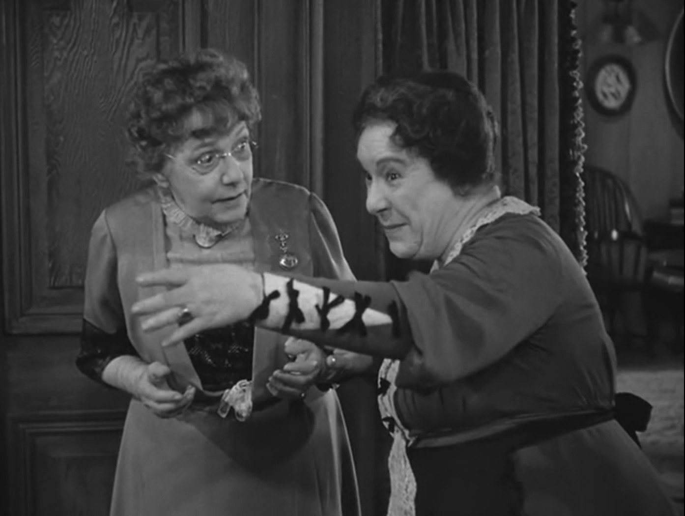 But before they depart, they stop to visit Mortimer's aunts Abby (Josephine Hull) and Martha (Jean Adair), who live with his brother Teddy (John Alexander).