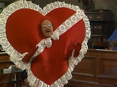 This episode gives us plenty of Valentine's Day atmosphere. In one of the best moments of "Billie's Valentine," David hires a man (Larry Gelman) to dress up like a Valentine heart and sing to Billie.